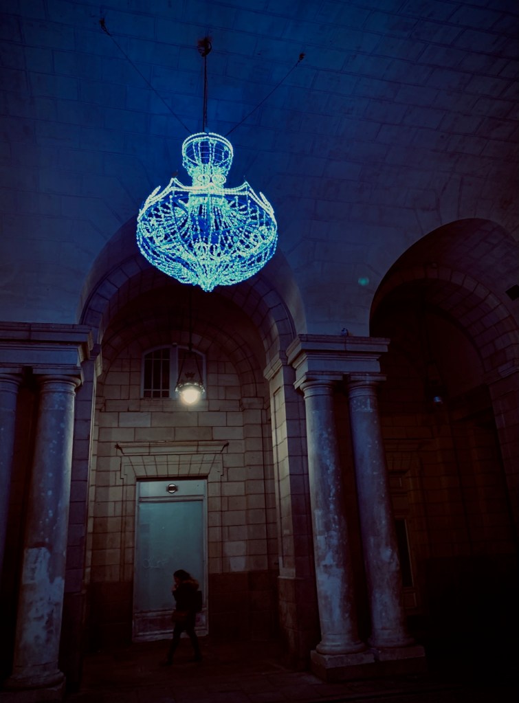 冬の湿った空と色褪せたクリスマスの喧騒の間で人々はコートの襟を立てる。