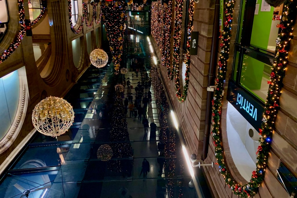 冬の湿った空と色褪せたクリスマスの喧騒の間で人々はコートの襟を立てる。