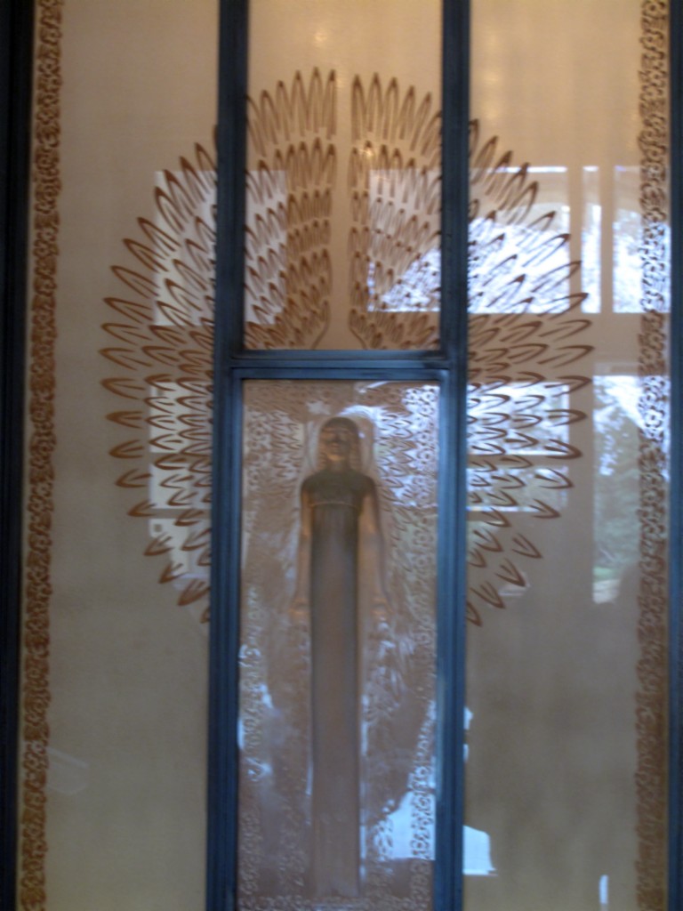 ラリックやラパンに圧倒されながら歩きまわる一階に比べると、二階は少し気持ちの余裕ができる空間でもある。ようやくラジエターカバーの紋様に目がいったり、排水溝の蓋の紋様を見たりする余裕が出来てくる。ふと窓から眺める外の風景もまたこの建築の設計の一部なのだろうとさえ思えてくるのだ。ラジエターカバーも、窓と一体化して見えてくると少し違って見えてくるというものである。