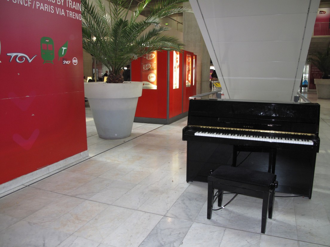 Les pianos en gare(駅でピアノ)、そのものずばりのタイトルは、むしろ想像を広げ、多くの人の支持を得てきた。駅だからか、下手なピアノもあまりうるさくない。腕に覚えがなくとも、少しだけなら弾けるという程度の人が、さっと座って鍵盤を確かめ、去って行くらしい。JRも駅でコンサートをやったりしているが、それとはまた違った場がそこに現れるのだ。羨ましいかぎりである。