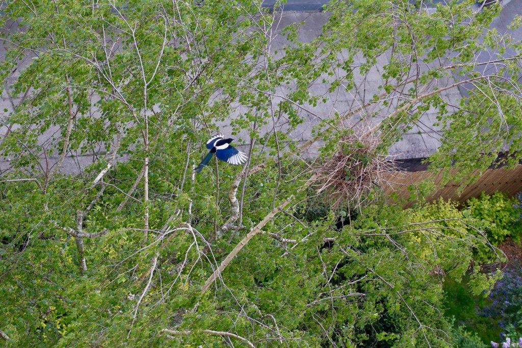Probably it’s a Magpie in English, just pie in French. It seems so busy for preparing for a new nest.