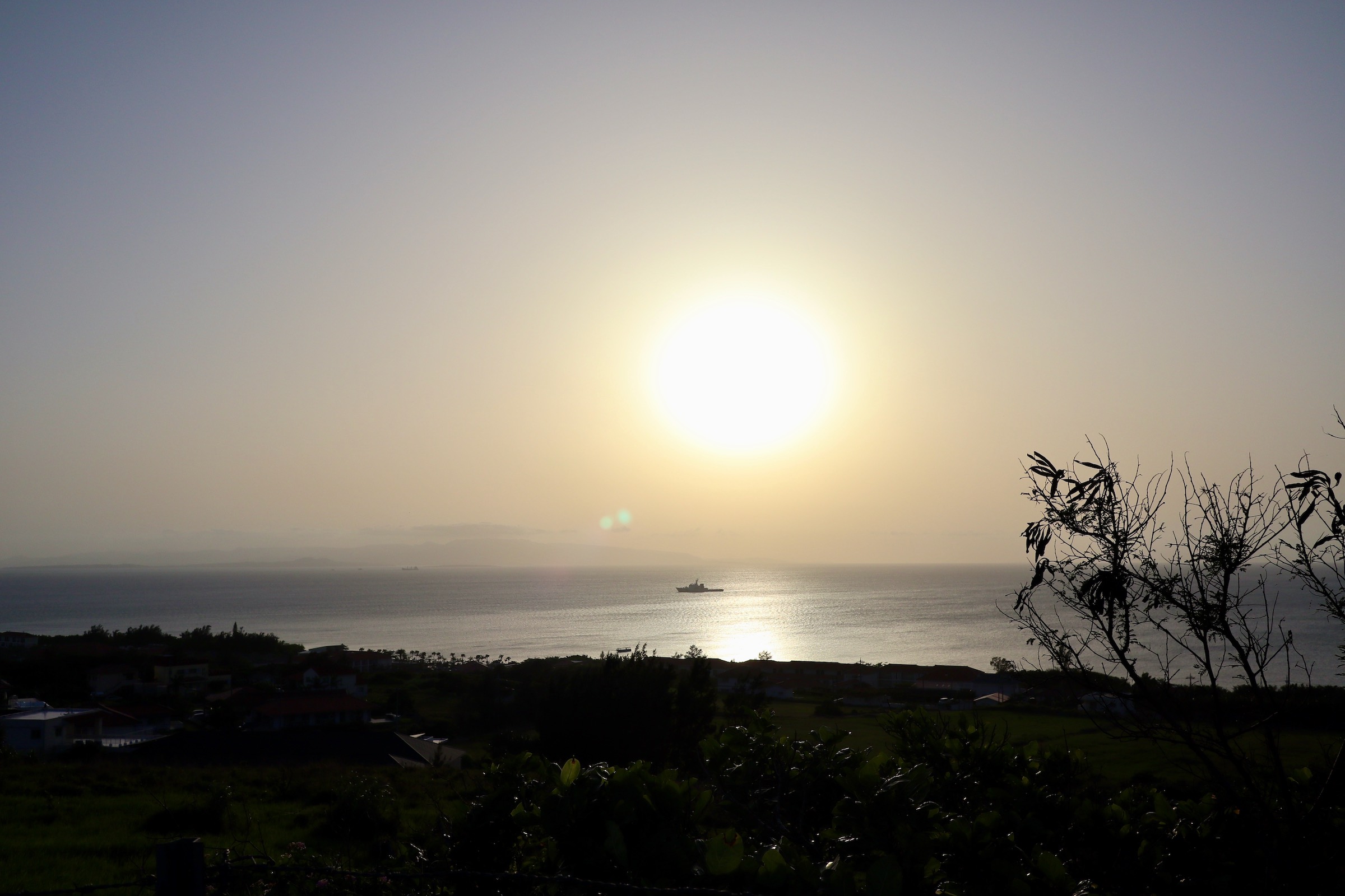 少し湿度が高くてぼんやりしているのが夕暮れにはぴったりでした。よく見ると奥に貨物船のようなものが見えますが、座礁船です。その奥の島は多分、嘉弥真島とそのさらに奥に小浜島(違ってたらごめんなさい)と八重山諸島が連なります。遠く、クジャク(外来種)とリュウキュウ・アカショウビンの鳴き声が響く穏やかなひとときでした。