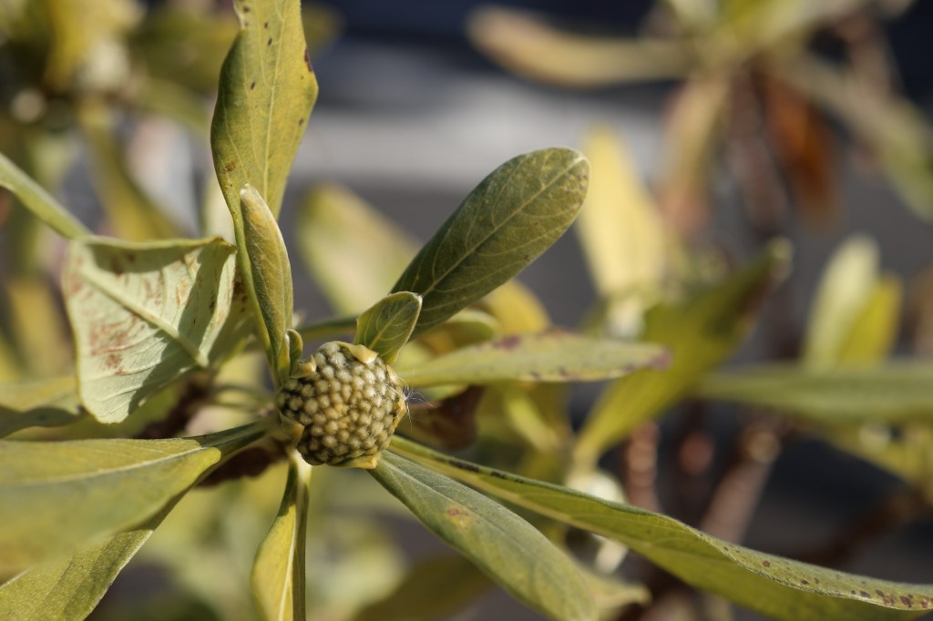 少々強引ではあるが、この写真には、すっきりしない入れ子構造のようなものがある。よく見ると、蕾の上に綿毛状の種がくっついているのである。