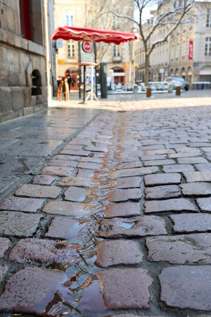 その「朝の風景」の軽やかなリズムに乗せてベルが本を読みながら歩く活気ある街の風景の中に、日本人にはあまり馴染みのない中世フランスらしい描写がある。街の建物の二階からたらいの水を撒くシーンである。ベルはどこかの店の前に吊るされた看板を手で押してその水を避けるのだが、その撒かれた水が流れるのがこの写真の溝である。いわゆる側溝が中央にあるものなのだが、石畳の路地の中央に凹みがあって、そこを雨水が流れ排水するようになっている。